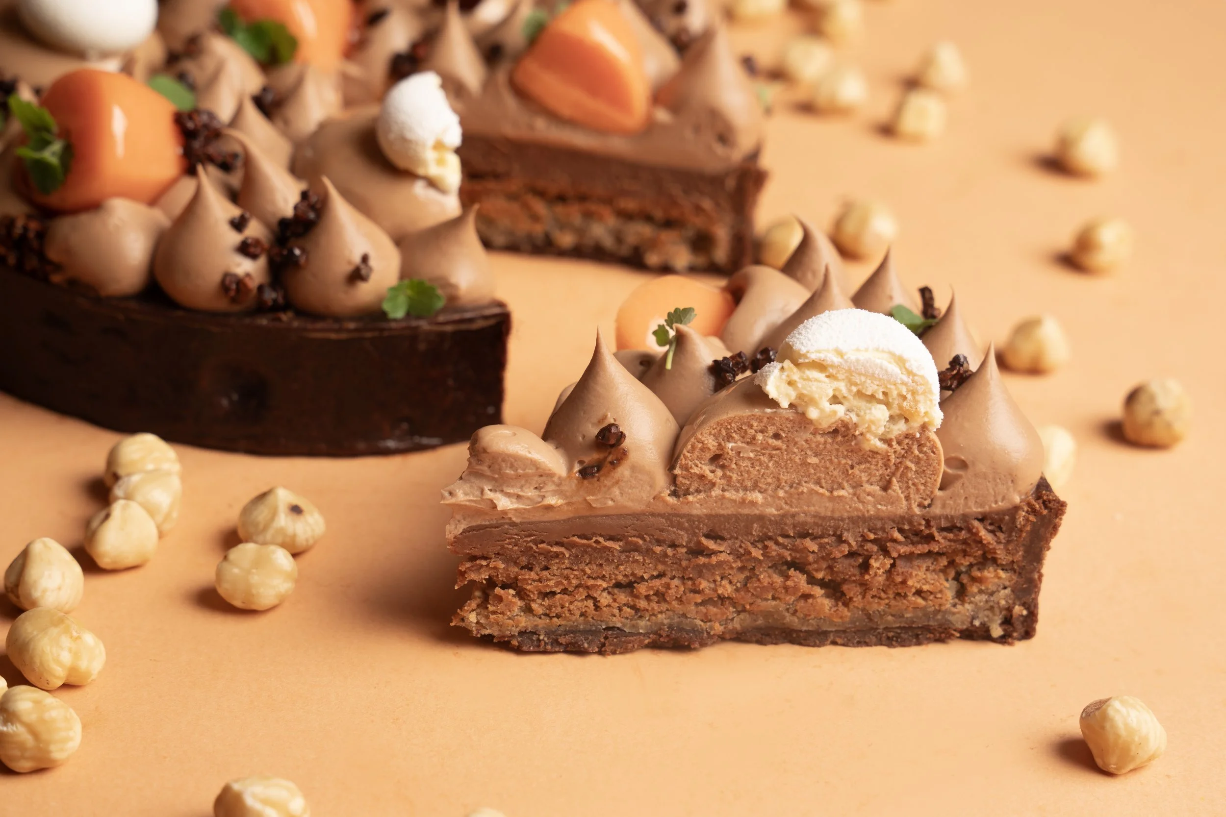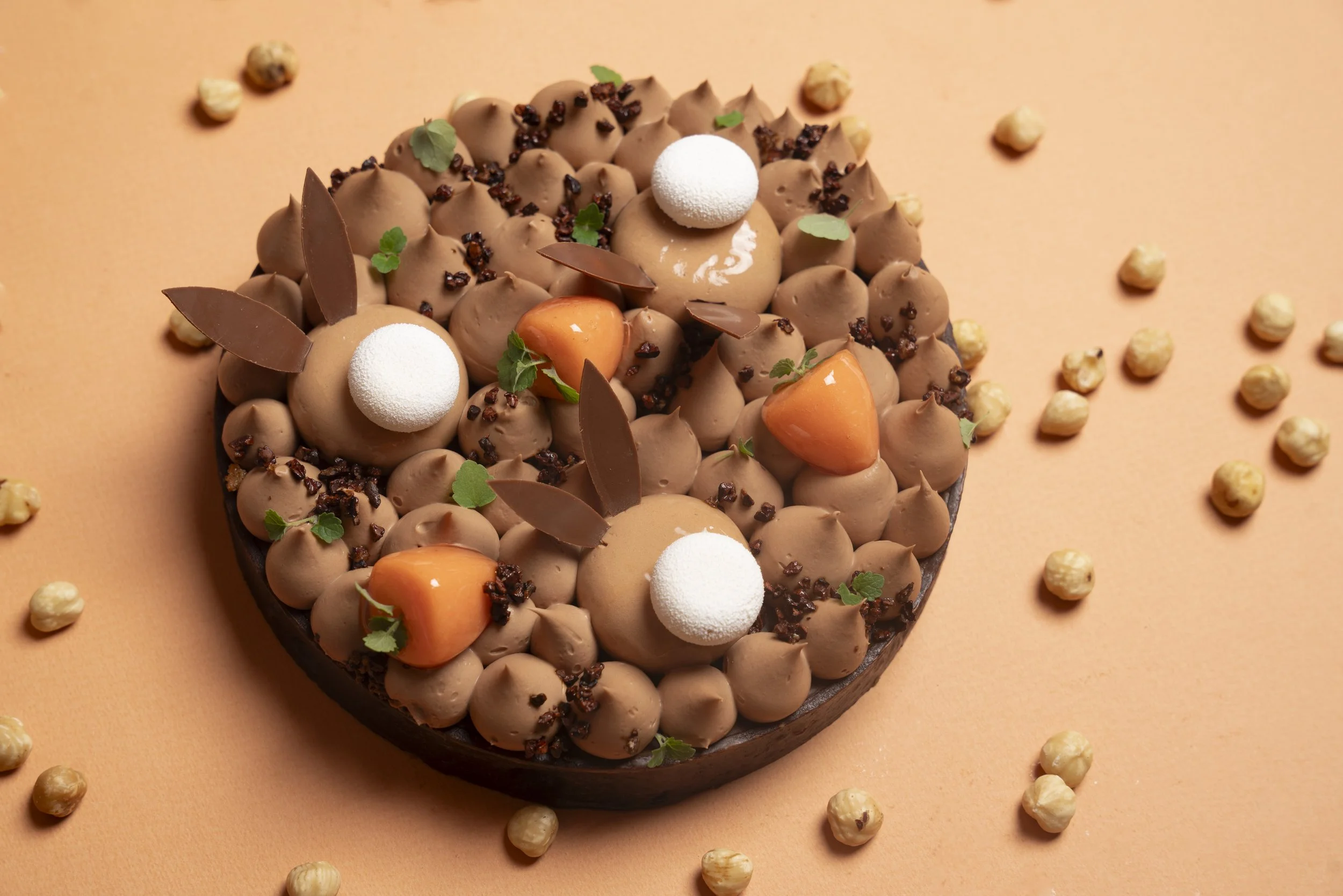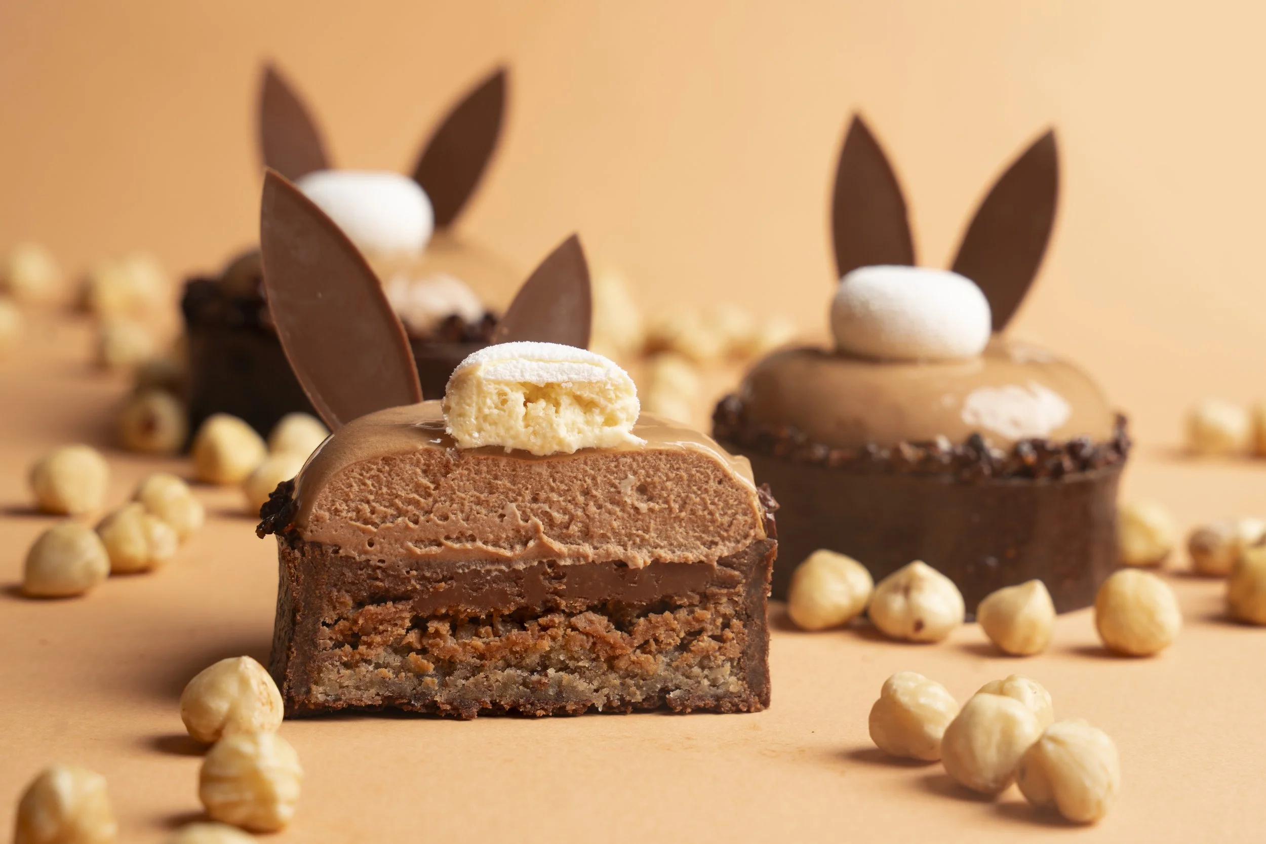 Inspirée du célèbre lapin en chocolat de notre enfance, cette création malicieuse mêle intensité et tendresse : une base cacao, un cœur de noisette ultra fondant, une mousse chocolat au lait toute douce, twistée par une touche fruitée de passion et une queue de namelaka qui pétille en bouche. À la fois fun, généreuse et irrésistiblement festive ! 🐰🍫