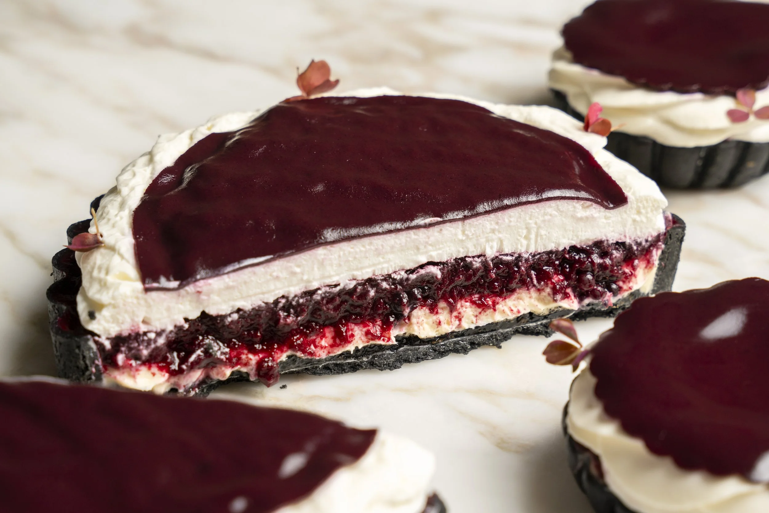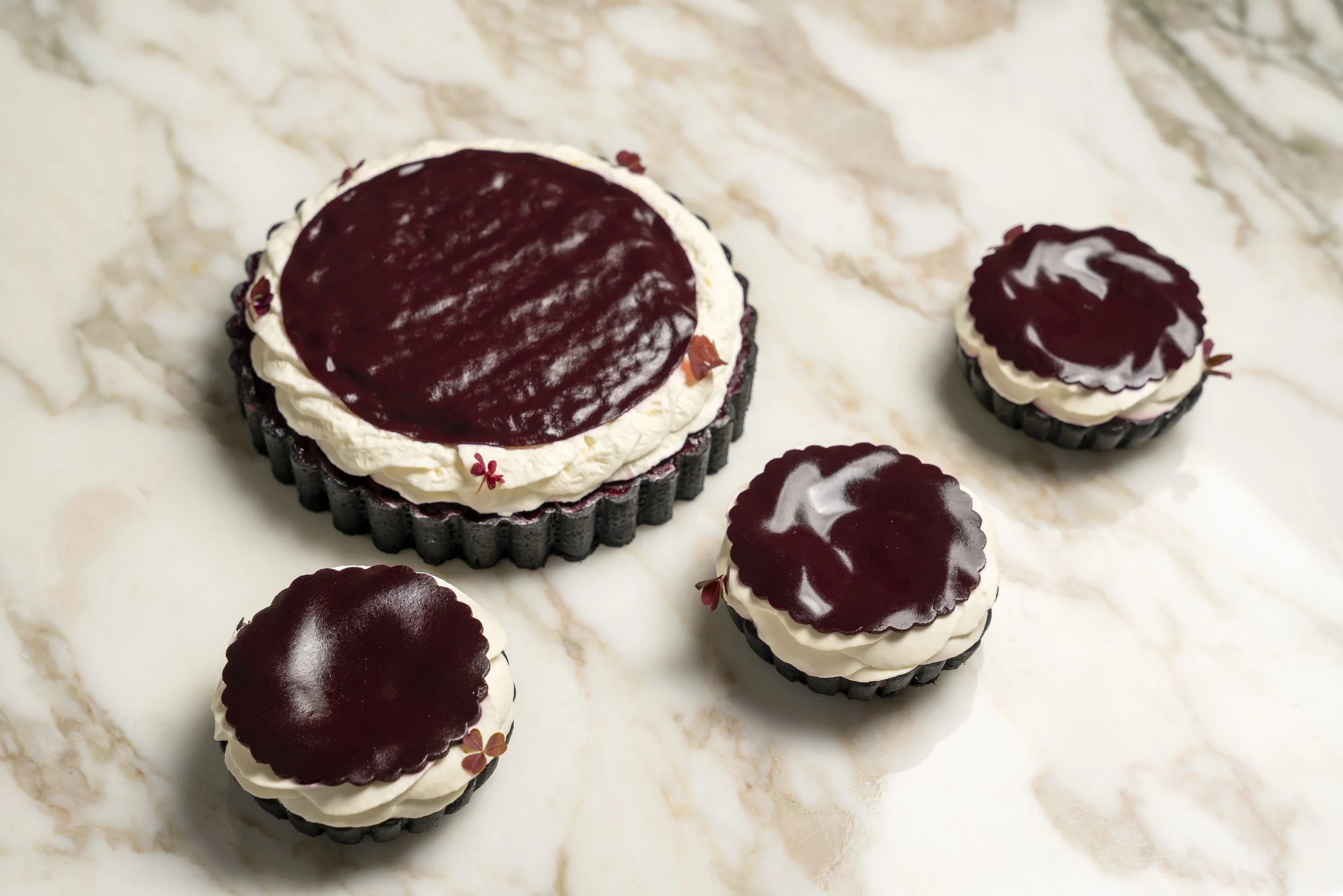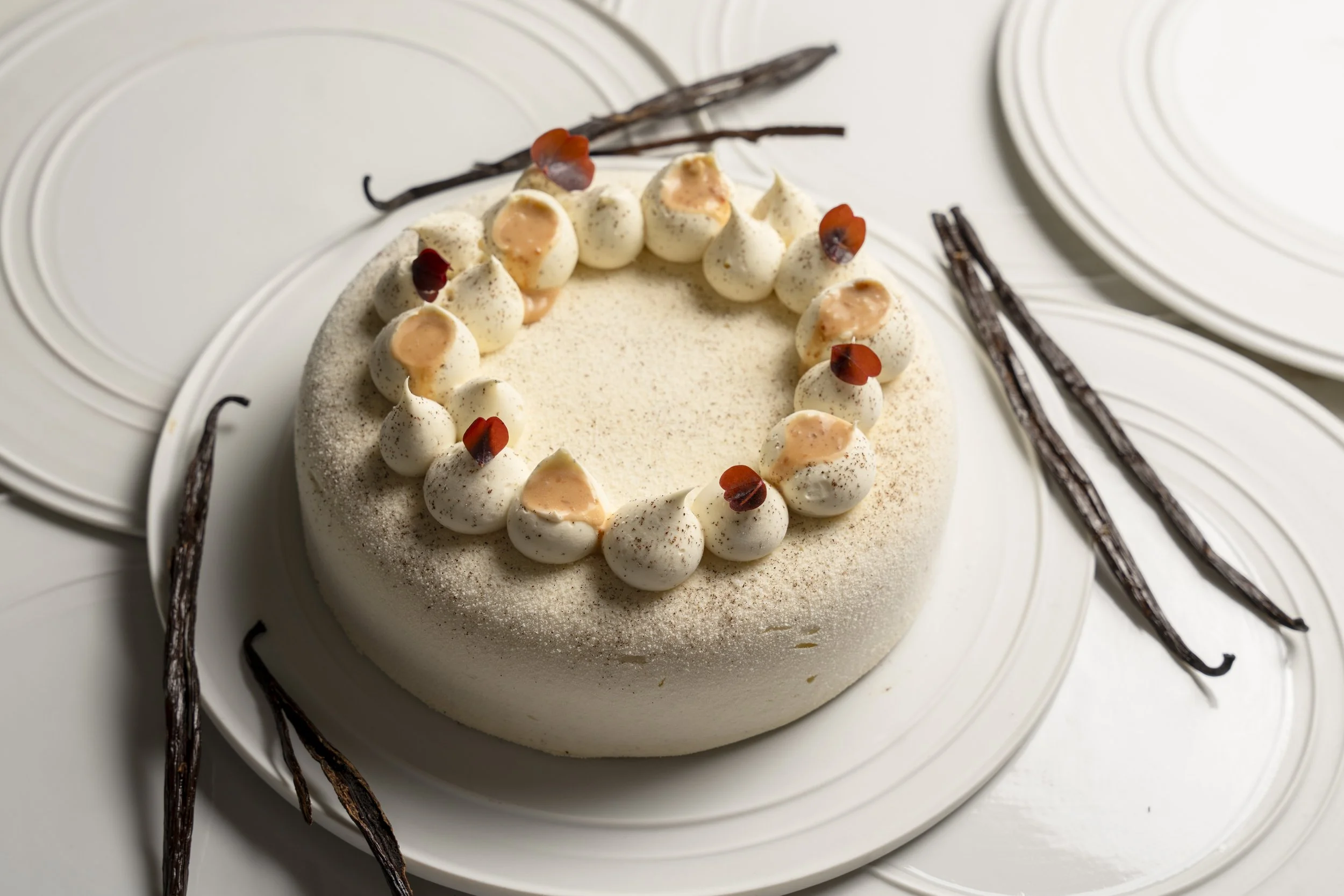 Pâte muscovado - crème amande coco - confit mangue basilic thaï gingembre - ganche montée coco - agar basilic thaï.