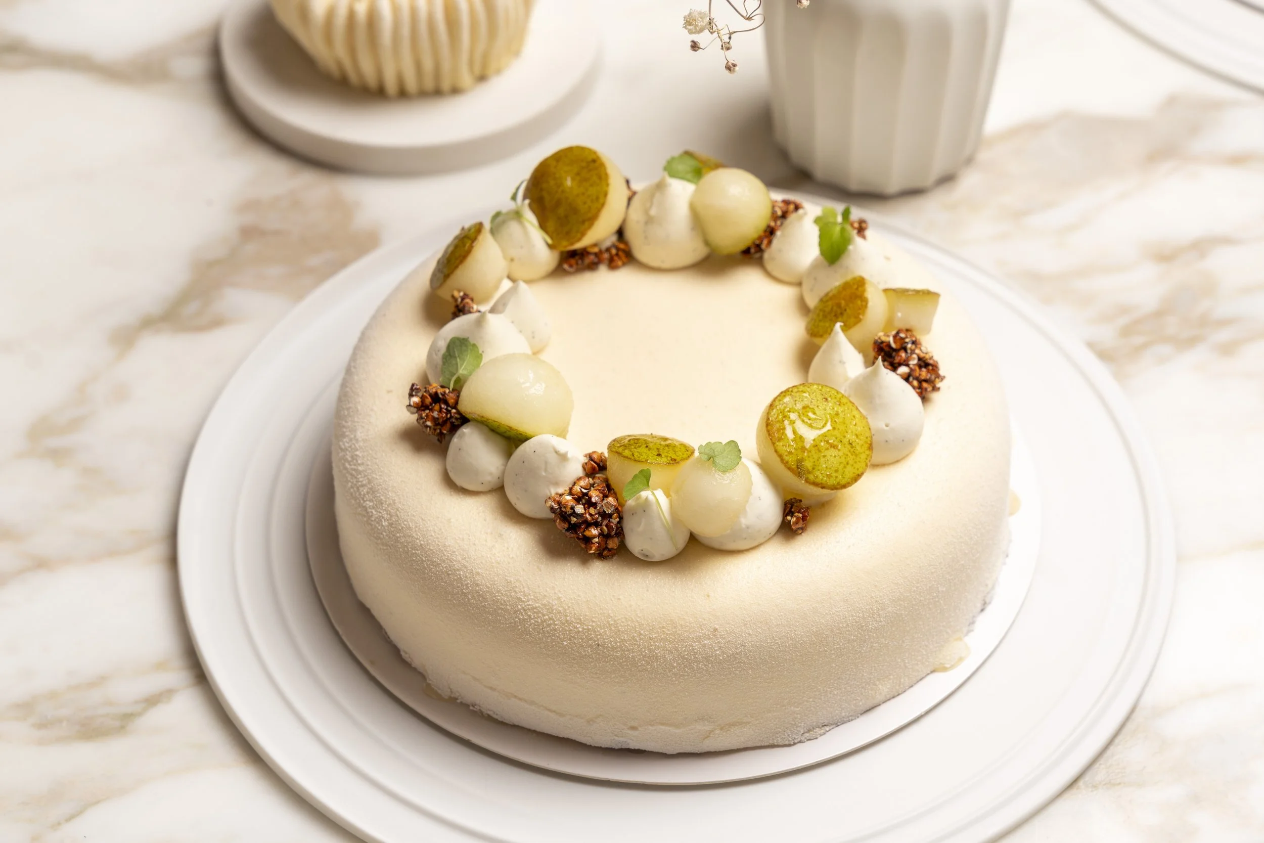 Biscuit Joconde yuzu sarrasin - croustillant sarrasin - confit poire yuzu - mousse légère vanille sarrasin - gel poire - poires fraîches - sarrasin rôti